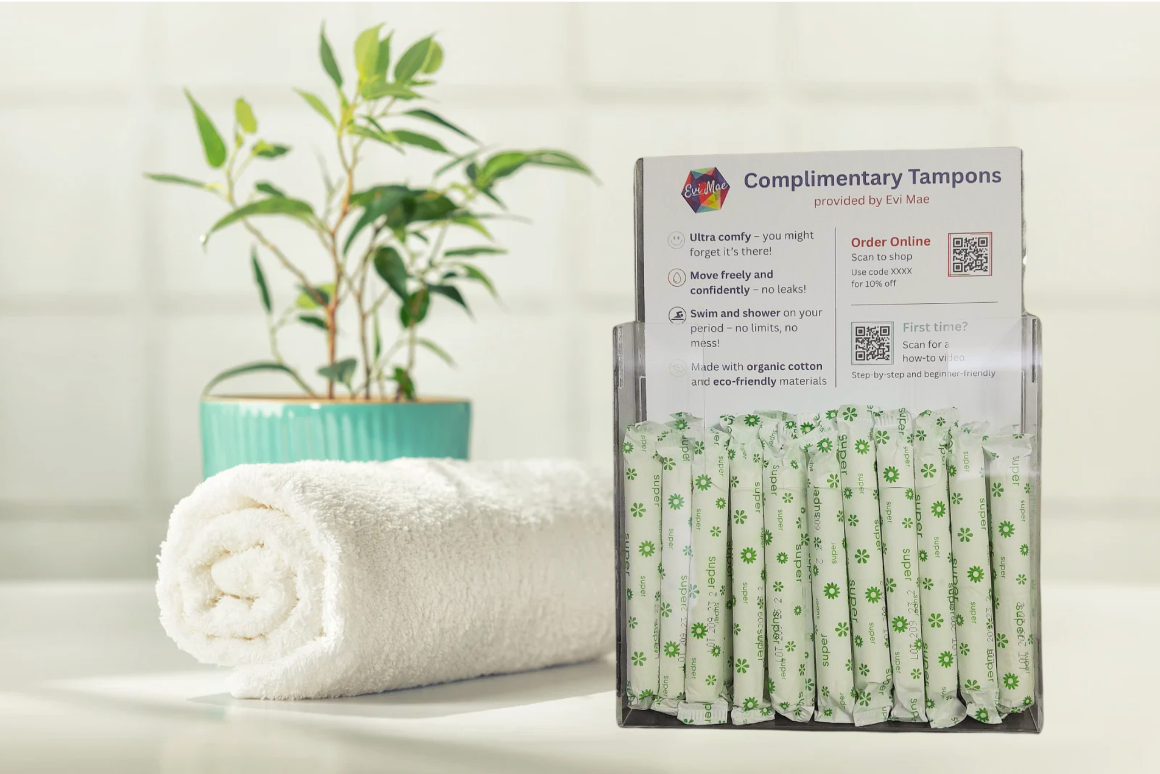 Evi Mae offers corporate rates, restroom countertop tampon stations, and bulk refill pricing for offices, coworking spaces, gyms, hotels, and hospitality spaces.